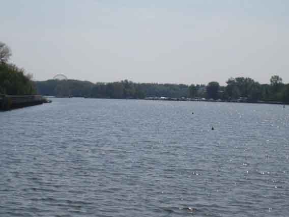 Blick von Stralau auf die INsel der Jugend vor dem Treptower Park>>>